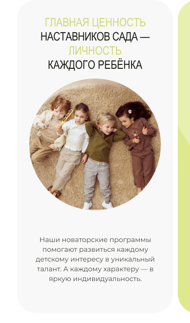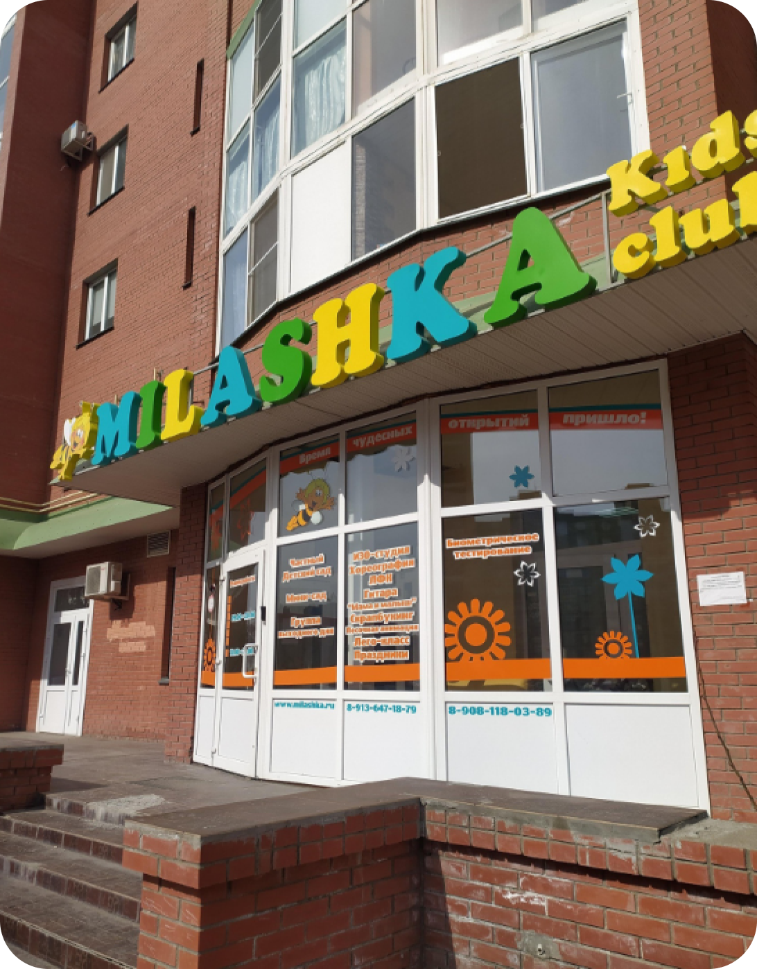 Частный детский сад «Milashkakidsclub” -лучший старт для будущего Вашего малыша! (Большим шрифтом) а снизу мелким: Наши квалифицированные педагоги - наставники помогают развивать интерес ребёнка к познанию нового, раскрывать талант, выделяя индивидуальность каждого!!!